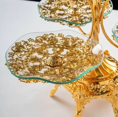 - Material: Strong metal with a shiny gold finish and thick glass dishes.